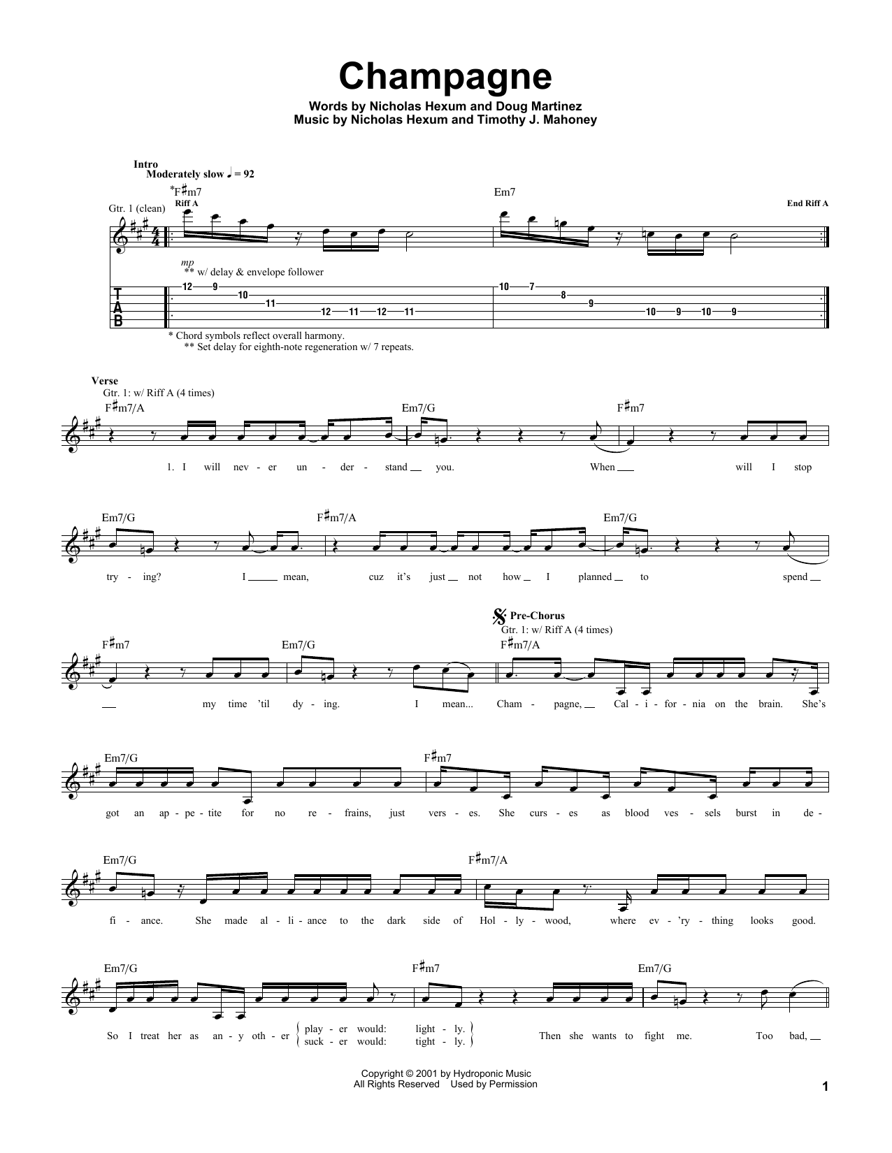311 Champagne sheet music, chords, lyrics - Printable PDF for Guitar Tab