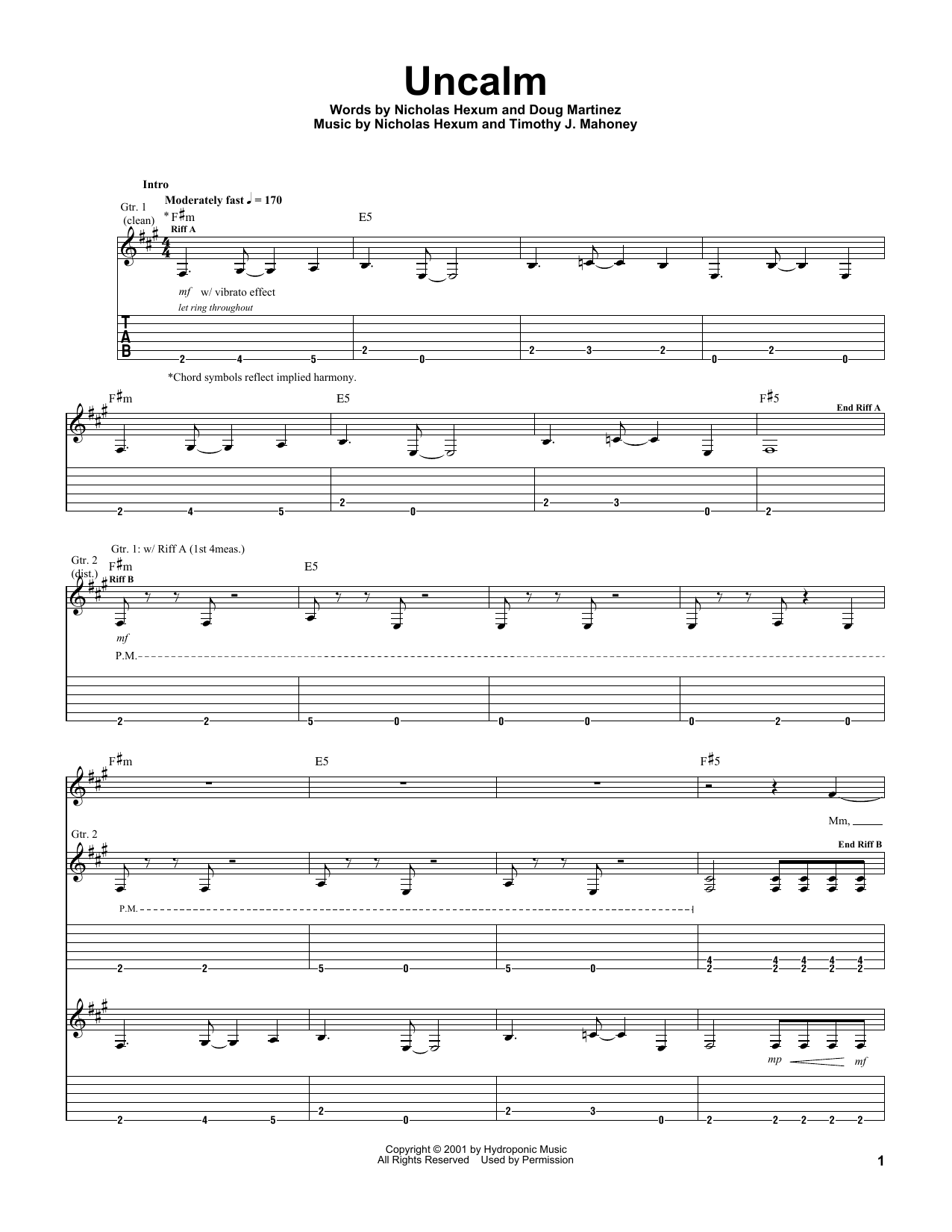 311 Uncalm sheet music, chords, lyrics - Printable PDF for Guitar Tab