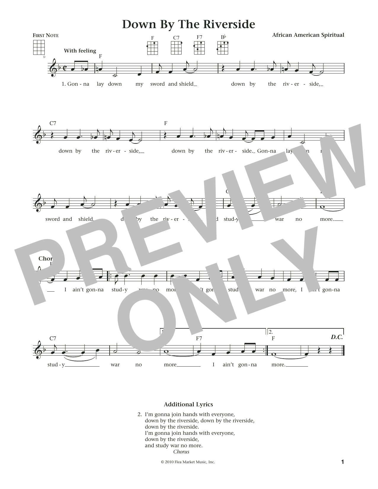 African American Spiritual Down By The Riverside sheet music, chords, lyrics - Printable PDF for Ukulele
