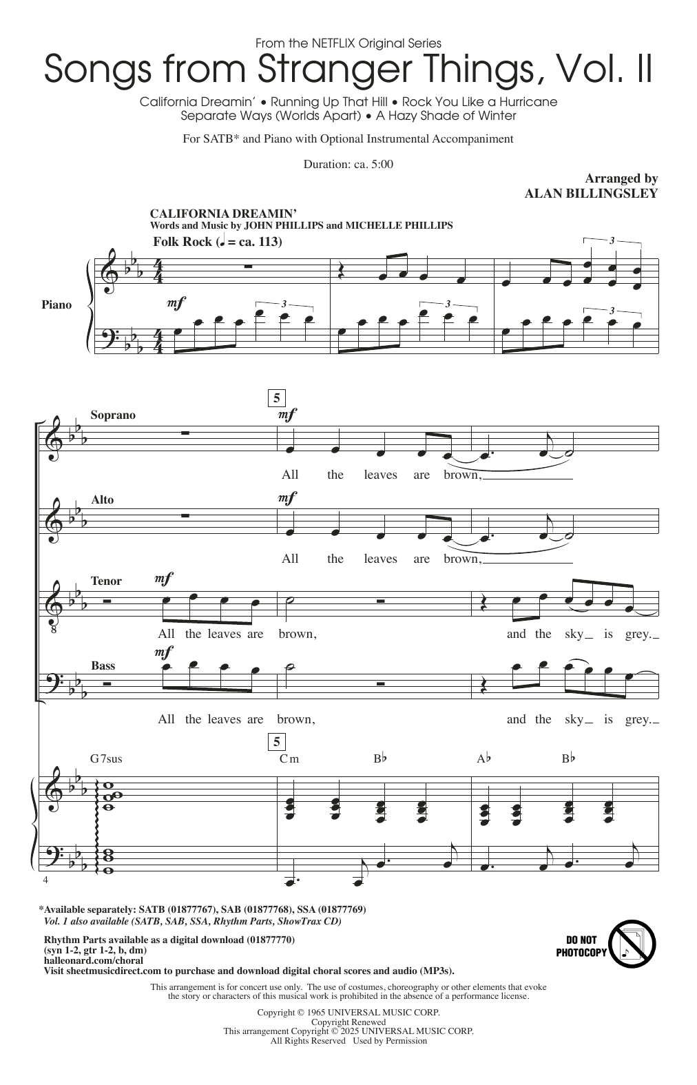 Download Alan Billingsley Songs from Stranger Things, Vol. II sheet music and printable PDF notes for SSA Choir. This score composition includes 18 page(s). It was wonderfuly put together for the style of Film/TV with catalog SKU number of 1840378. Popular song was originally published on 2025-10-08T00:00:00 and was updated on 2025-10-08T00:00:00. The arrangement code for Alan Billingsley sheet music is SSA and minimum required purchase quantaty of the digital score is 10. Learn more about Alan Billingsley and click here ».