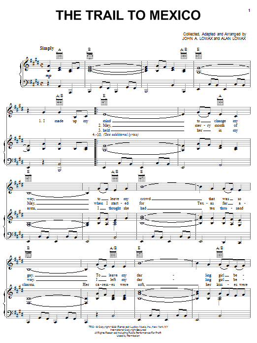 Alan Lomax The Trail To Mexico sheet music, chords, lyrics - Printable PDF for Piano, Vocal & Guitar (Right-Hand Melody)