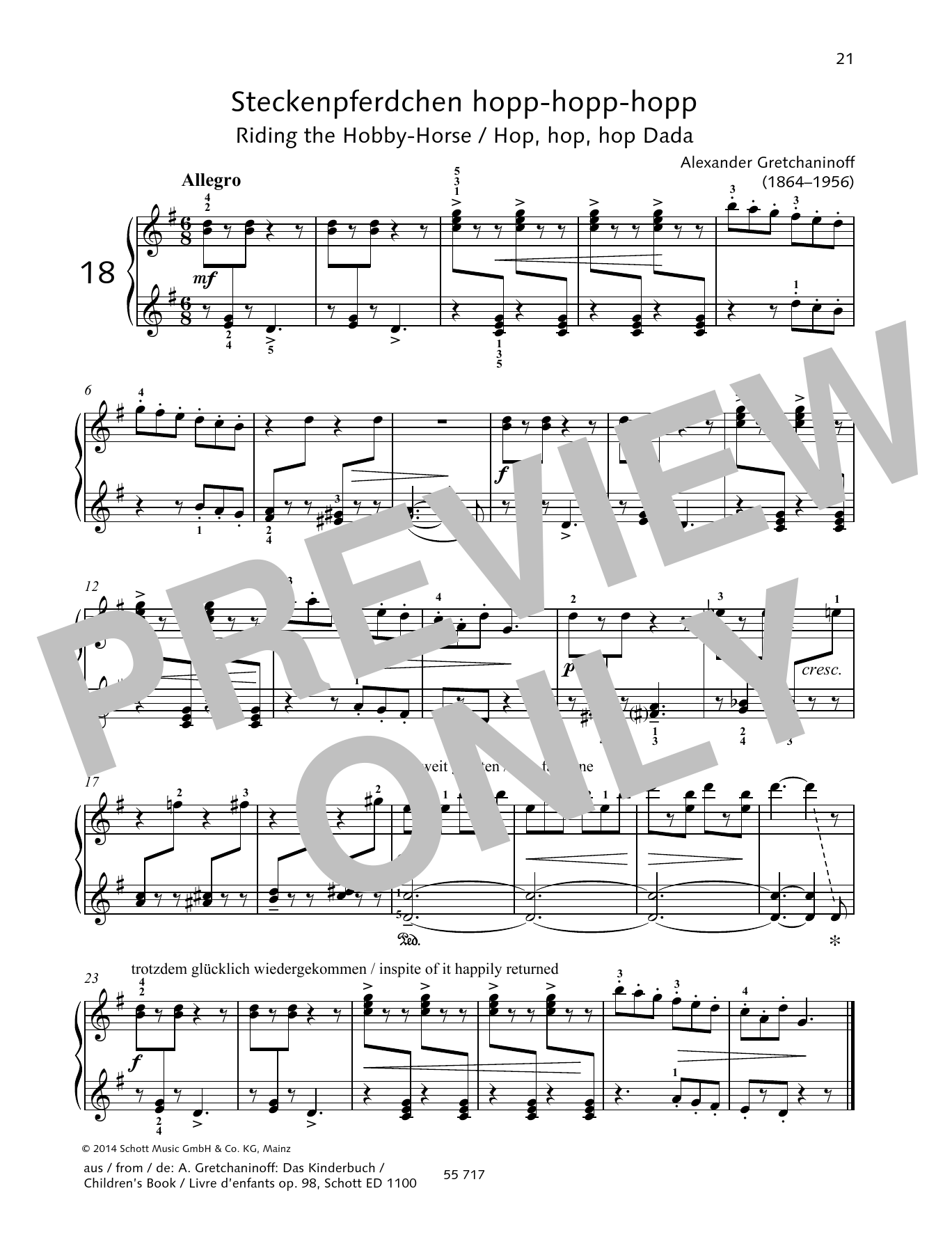 * Please, make sure you check if transposition is possible before your complete your online purchase. You do that by clicking the "notes" icon at the bottom of the interactive viewer. If transposition is available, then various semitones transposition options will appear. If not, the notes icon will remain grayed. Most of our scores are traponsosable, but not all of them.So, check if Alexander Gretchaninoff Riding the Hobby-Horse Sheet Music is indeed transposable before completing your online purchase!