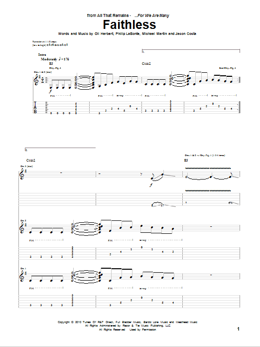 Download All That Remains Faithless sheet music and printable PDF notes for Guitar Tab. This score composition includes 9 page(s). It was wonderfuly put together for the style of Metal with catalog SKU number of 80594. Popular song was originally published on 2011-04-14T00:00:00 and was updated on 2020-11-06T00:00:00. The arrangement code for All That Remains sheet music is TAB and minimum required purchase quantaty of the digital score is 1. Learn more about All That Remains and click here ».