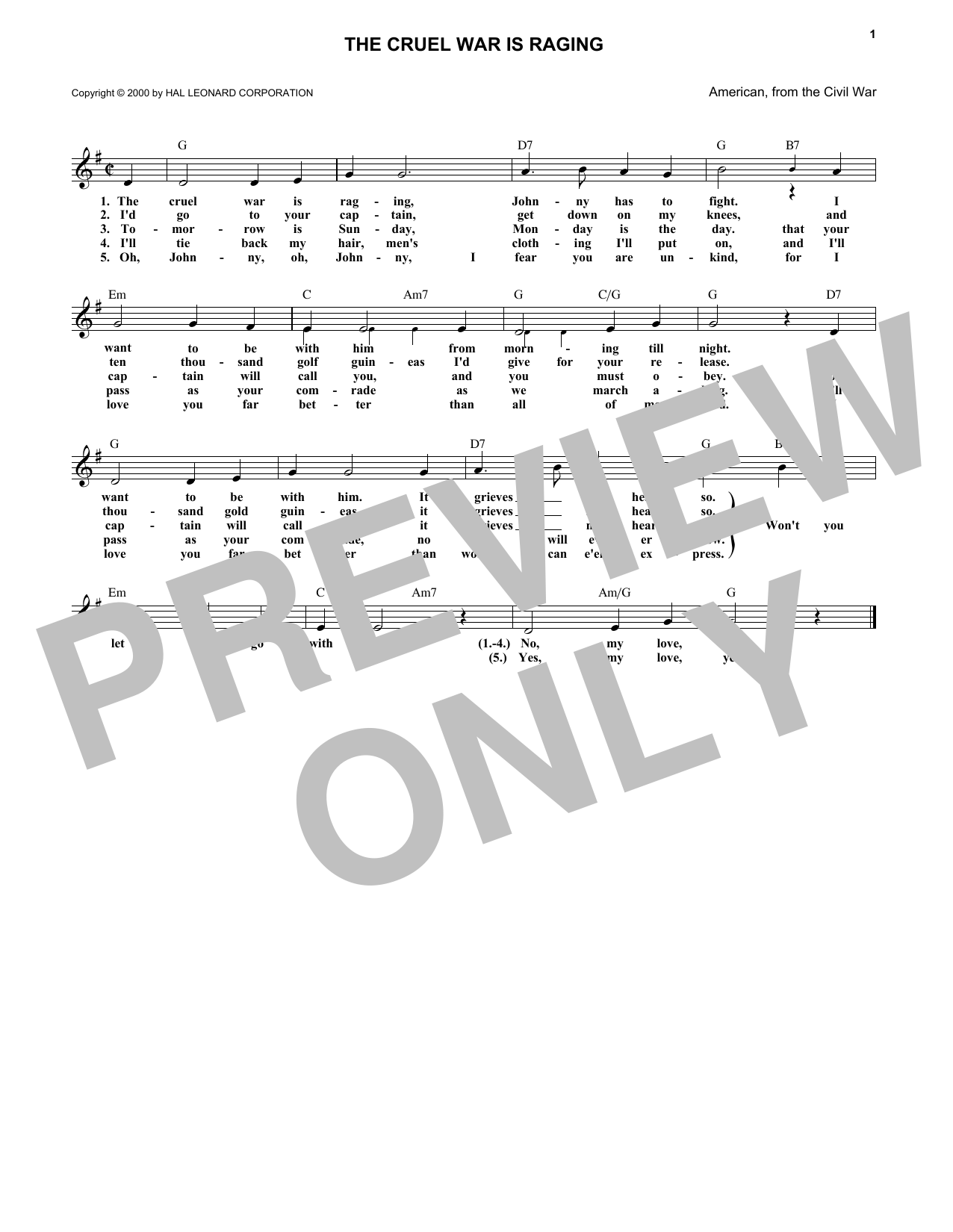 American Folksong The Cruel War Is Raging sheet music, chords, lyrics - Printable PDF for Melody Line, Lyrics & Chords