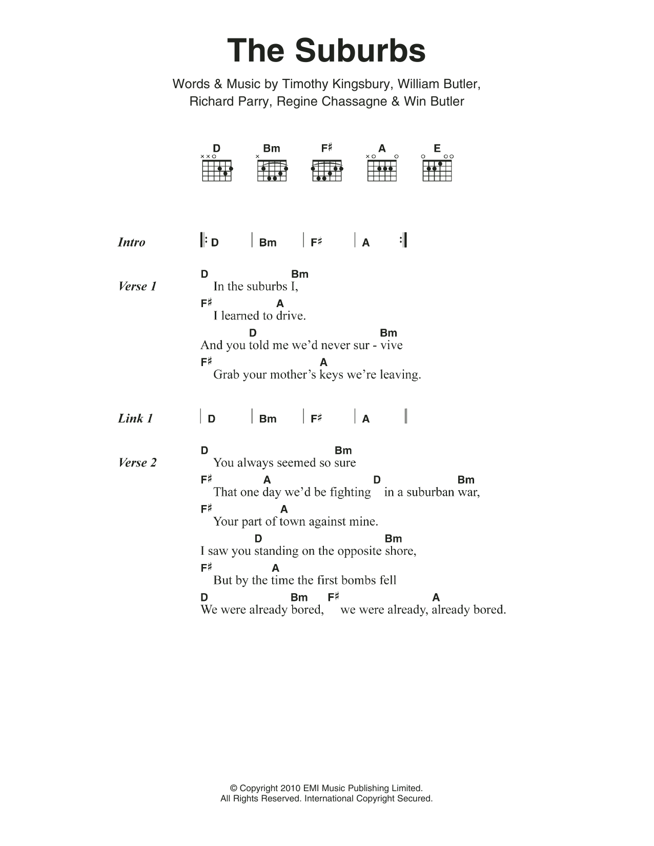 Arcade Fire The Suburbs sheet music, chords, lyrics - Printable PDF for Lyrics & Chords