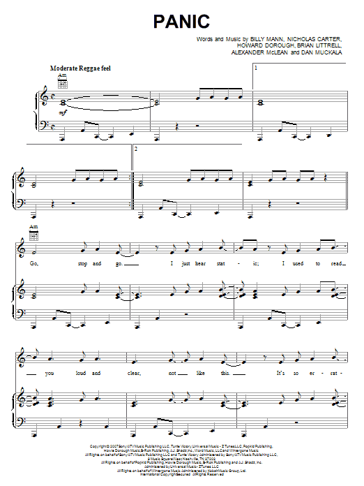 Download Backstreet Boys Panic sheet music and printable PDF notes for Piano, Vocal & Guitar Chords (Right-Hand Melody). This score composition includes 8 page(s). It was wonderfuly put together for the style of Pop with catalog SKU number of 67083. Popular song was originally published on 2008-10-02T00:00:00 and was updated on 2021-11-10T00:00:00. The arrangement code for Backstreet Boys sheet music is PVGRHM and minimum required purchase quantaty of the digital score is 1. Learn more about Backstreet Boys and click here ».