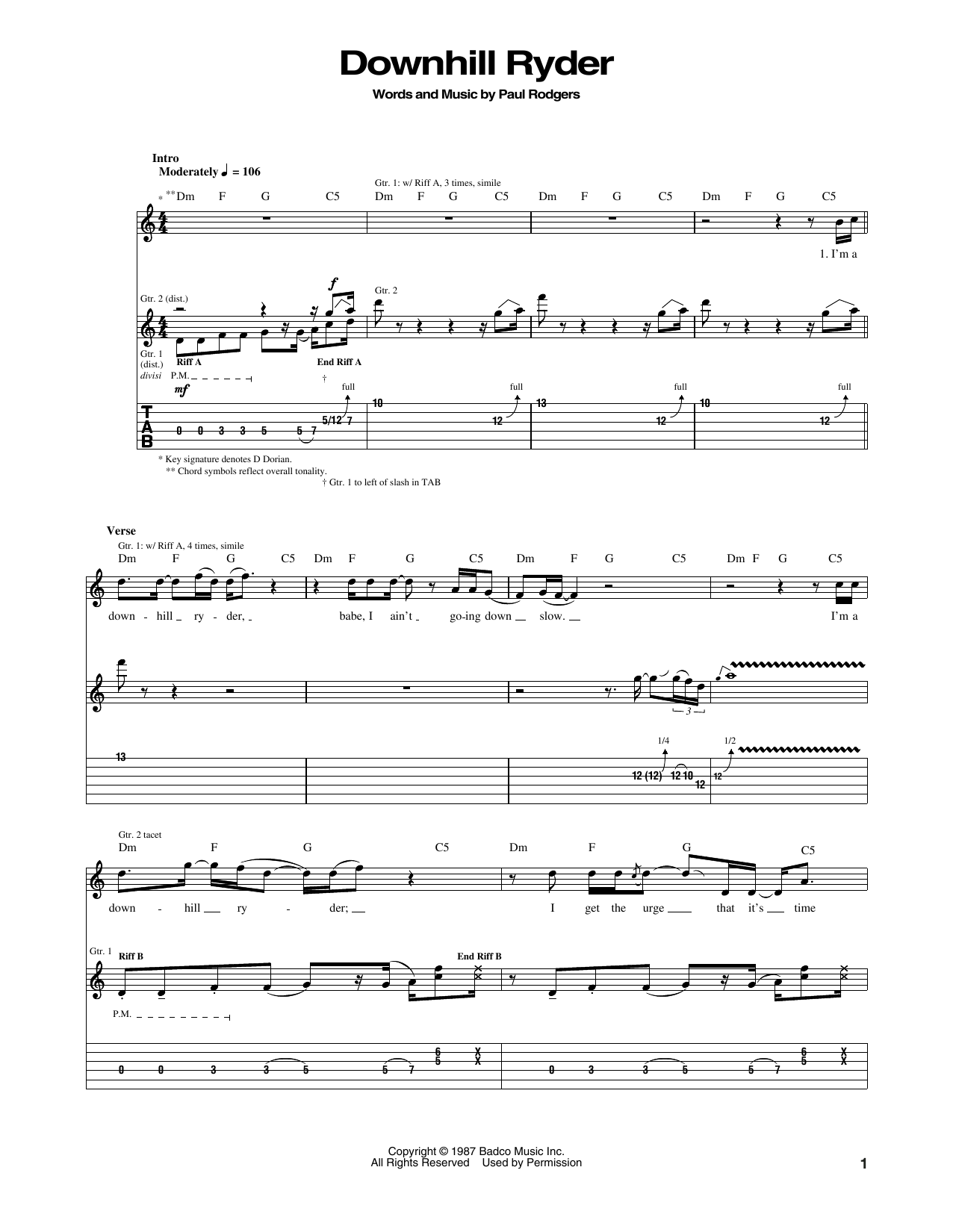 Download 7-Page Bad Company Downhill Ryder sheet music | Printable PDF Digital Notes