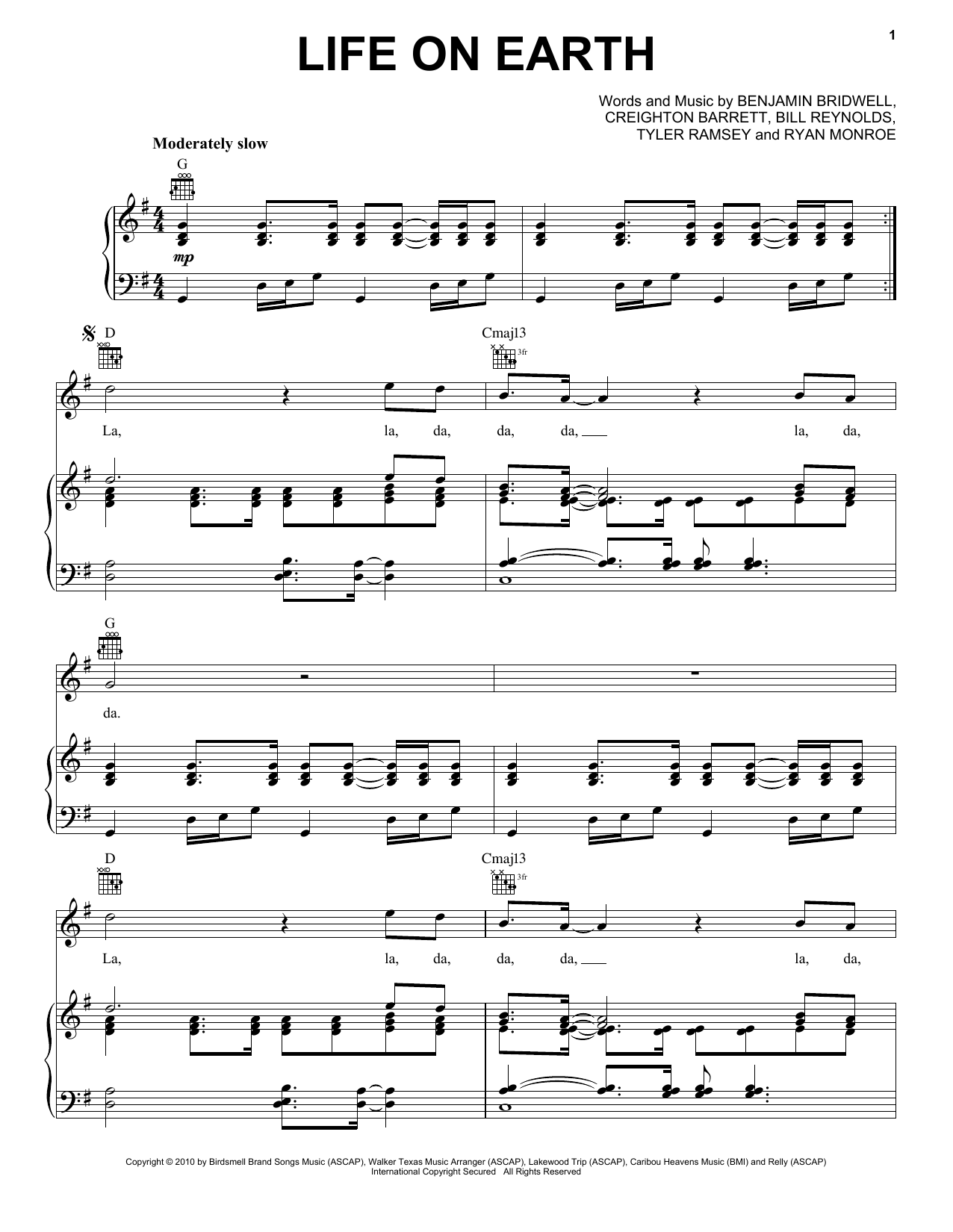 Band Of Horses Life On Earth sheet music, chords, lyrics - Printable PDF for Piano, Vocal & Guitar (Right-Hand Melody)