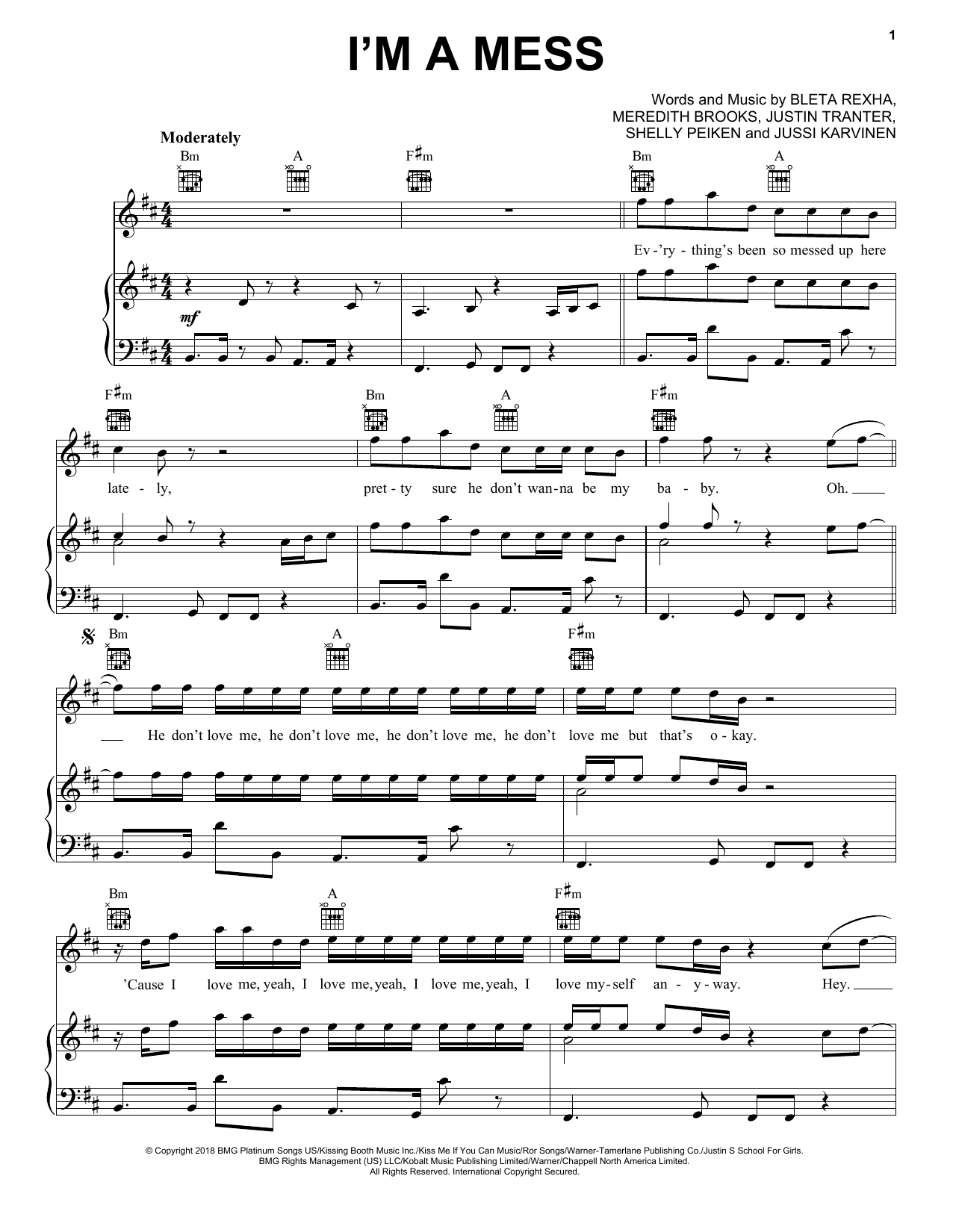Bebe Rexha I'm A Mess sheet music, chords, lyrics - Printable PDF for Piano, Vocal & Guitar (Right-Hand Melody)