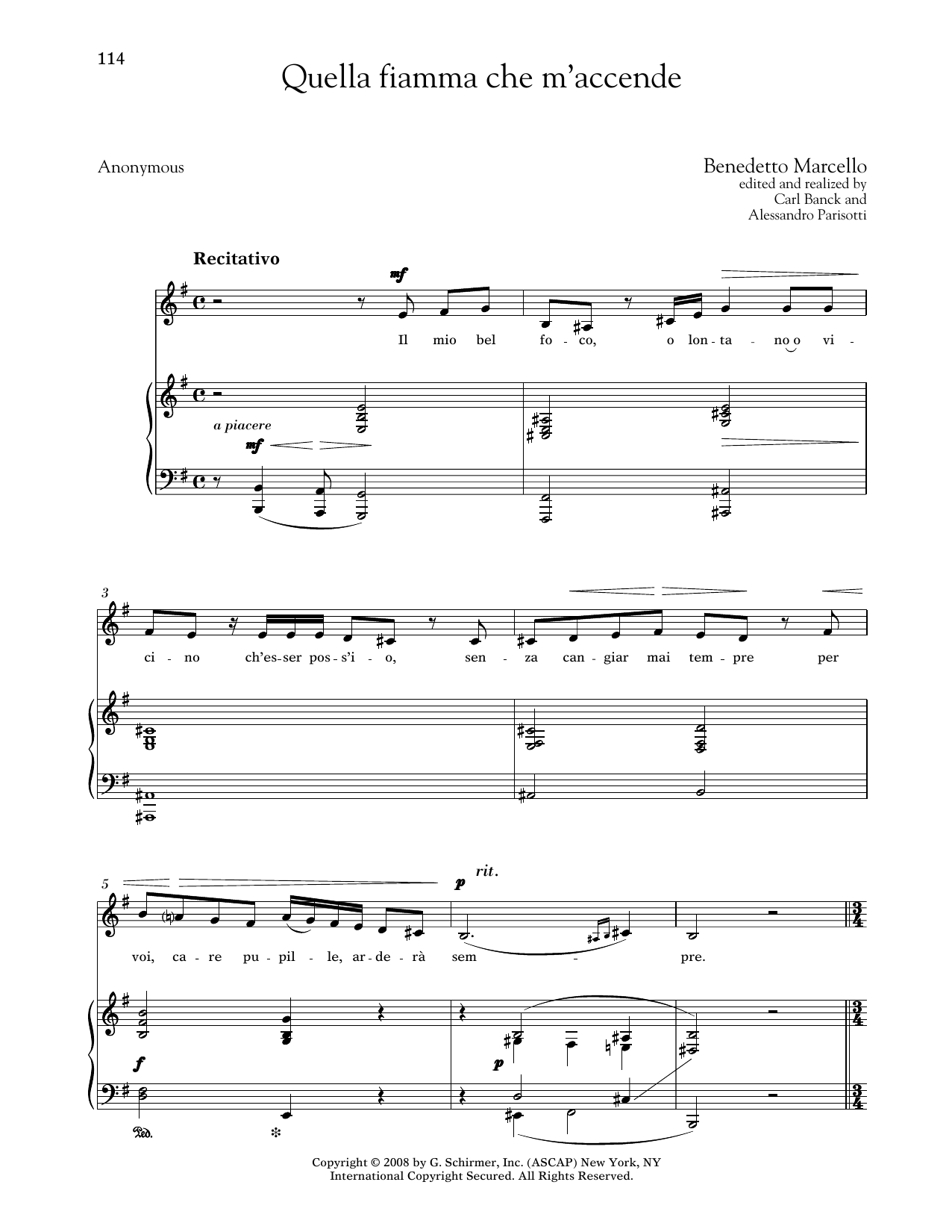 Download Benedetto Marcello Quella Fiamma Che M'accende (Medium Low Voice) sheet music and printable PDF notes for Piano & Vocal. This score composition includes 6 page(s). It was wonderfuly put together for the style of Classical with catalog SKU number of 1689405. Popular song was originally published on 2025-01-24T00:00:00 and was updated on 2025-08-12T00:00:00. The arrangement code for Benedetto Marcello sheet music is PV and minimum required purchase quantaty of the digital score is 1. Learn more about Benedetto Marcello and click here ».