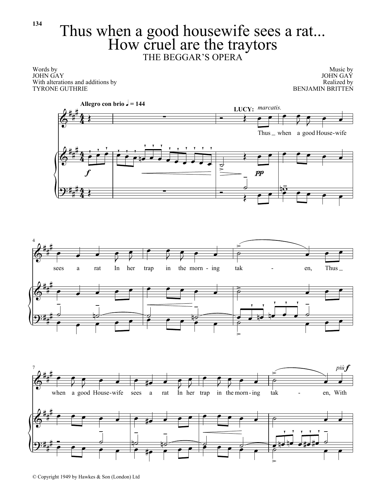 Benjamin Britten Thus when A good housewife sees a rat...How cruel are the traytors (from The Beggar's Opera) sheet music, chords, lyrics - Printable PDF for Piano & Vocal