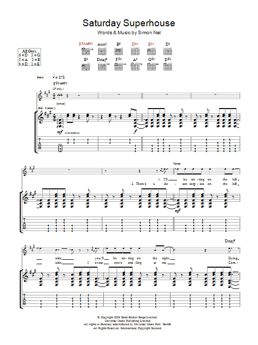 Biffy Clyro Saturday Superhouse sheet music, chords, lyrics - Printable PDF for Guitar Tab