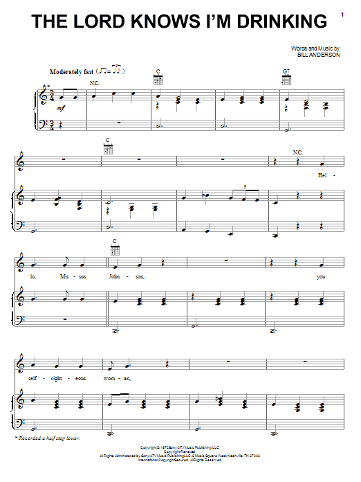 Bill Anderson The Lord Knows I'm Drinking sheet music, chords, lyrics - Printable PDF for Piano, Vocal & Guitar (Right-Hand Melody)