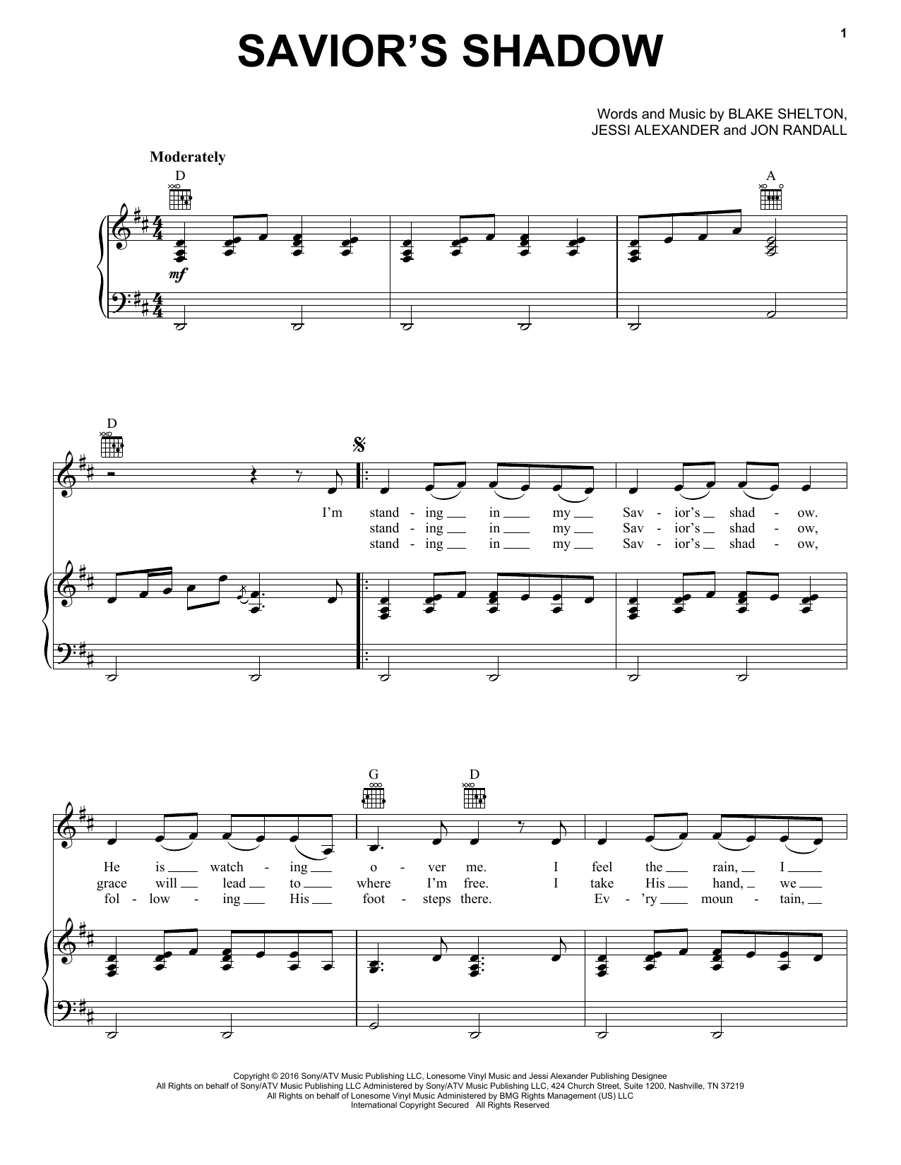 Download Blake Shelton Savior's Shadow sheet music and printable PDF notes for Piano, Vocal & Guitar Chords (Right-Hand Melody). This score composition includes 4 page(s). It was wonderfuly put together for the style of Country with catalog SKU number of 170566. Popular song was originally published on 2016-06-01T00:00:00 and was updated on 2022-03-07T00:00:00. The arrangement code for Blake Shelton sheet music is PVGRHM and minimum required purchase quantaty of the digital score is 1. Learn more about Blake Shelton and click here ».