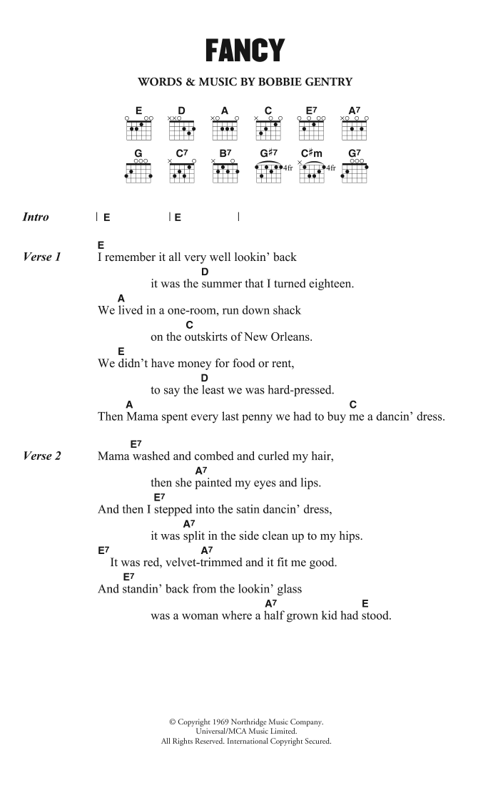 Bobbie Gentry Fancy sheet music, chords, lyrics - Printable PDF for Lyrics & Chords