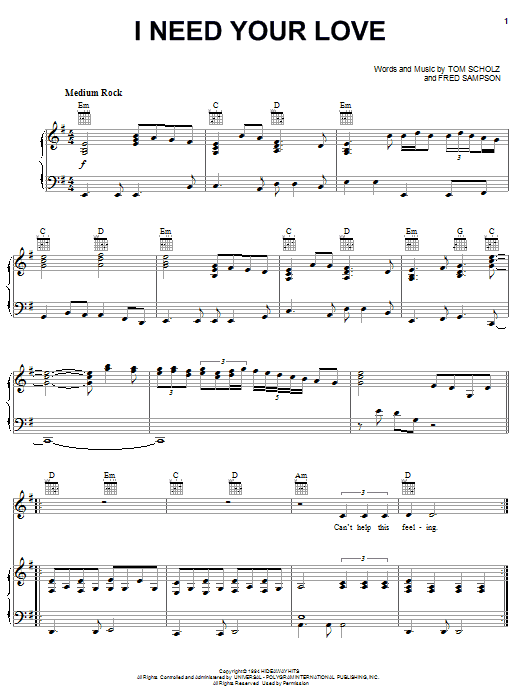 Boston I Need Your Love sheet music, chords, lyrics - Printable PDF for Piano, Vocal & Guitar (Right-Hand Melody)