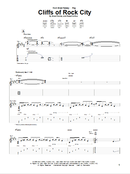 Download Brad Paisley Cliffs Of Rock City sheet music and printable PDF notes for Guitar Tab. This score composition includes 11 page(s). It was wonderfuly put together for the style of Country with catalog SKU number of 74027. Popular song was originally published on 2010-03-29T00:00:00 and was updated on 2022-10-26T00:00:00. The arrangement code for Brad Paisley sheet music is TAB and minimum required purchase quantaty of the digital score is 1. Learn more about Brad Paisley and click here ».