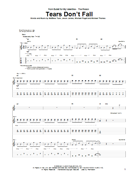Bullet For My Valentine Tears Don't Fall sheet music, chords, lyrics - Printable PDF for Guitar Tab