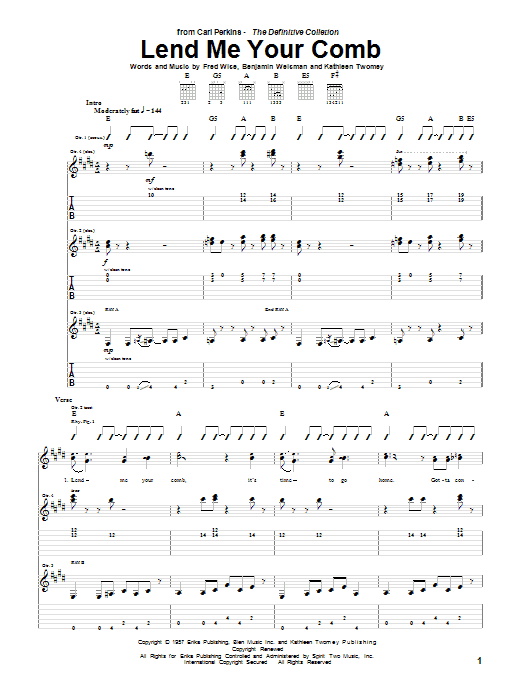 Carl Perkins Lend Me Your Comb sheet music, chords, lyrics - Printable PDF for Guitar Tab