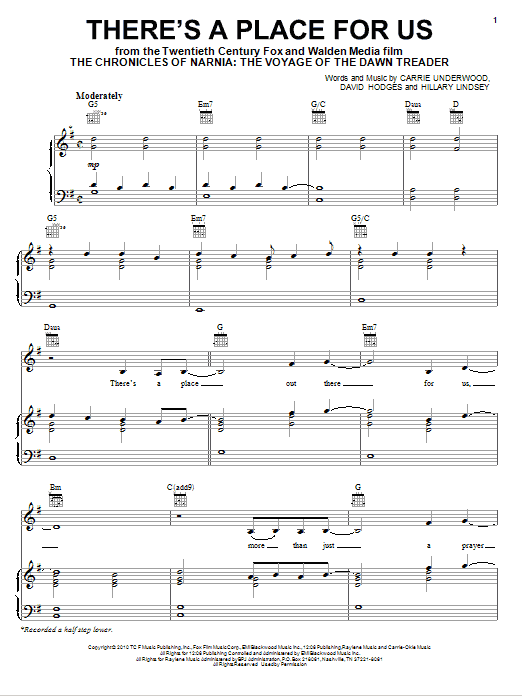 Carrie Underwood There's A Place For Us sheet music, chords, lyrics - Printable PDF for Piano, Vocal & Guitar (Right-Hand Melody)