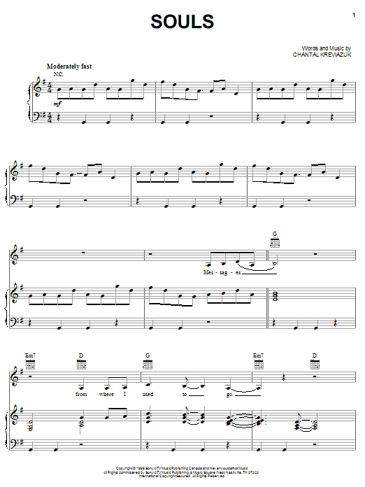 Chantal Kreviazuk Souls sheet music, chords, lyrics - Printable PDF for Piano, Vocal & Guitar (Right-Hand Melody)
