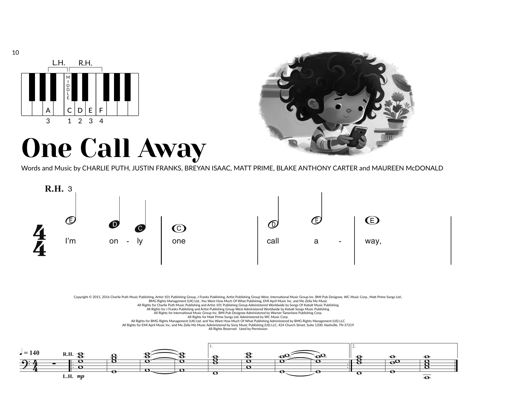 Download Charlie Puth One Call Away (arr. Brittany McCorriston) sheet music and printable PDF notes for Very Beginner Piano. This score composition includes 2 page(s). It was wonderfuly put together for the style of Pop with catalog SKU number of 1669620. Popular song was originally published on 2024-12-19T00:00:00 and was updated on 2025-08-26T00:00:00. The arrangement code for Charlie Puth sheet music is VBEGPS and minimum required purchase quantaty of the digital score is 1. Learn more about Charlie Puth and click here ».