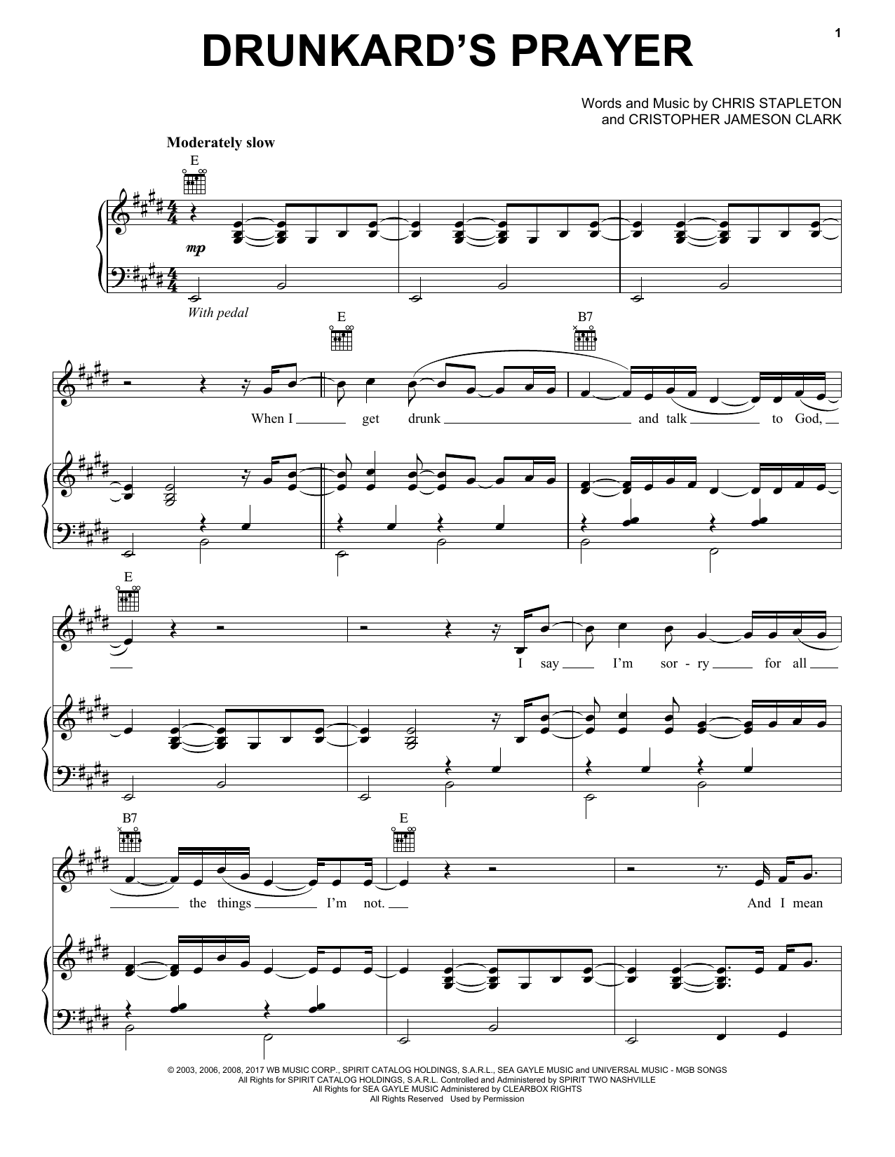 Chris Stapleton Drunkard's Prayer sheet music, chords, lyrics - Printable PDF for Piano, Vocal & Guitar (Right-Hand Melody)