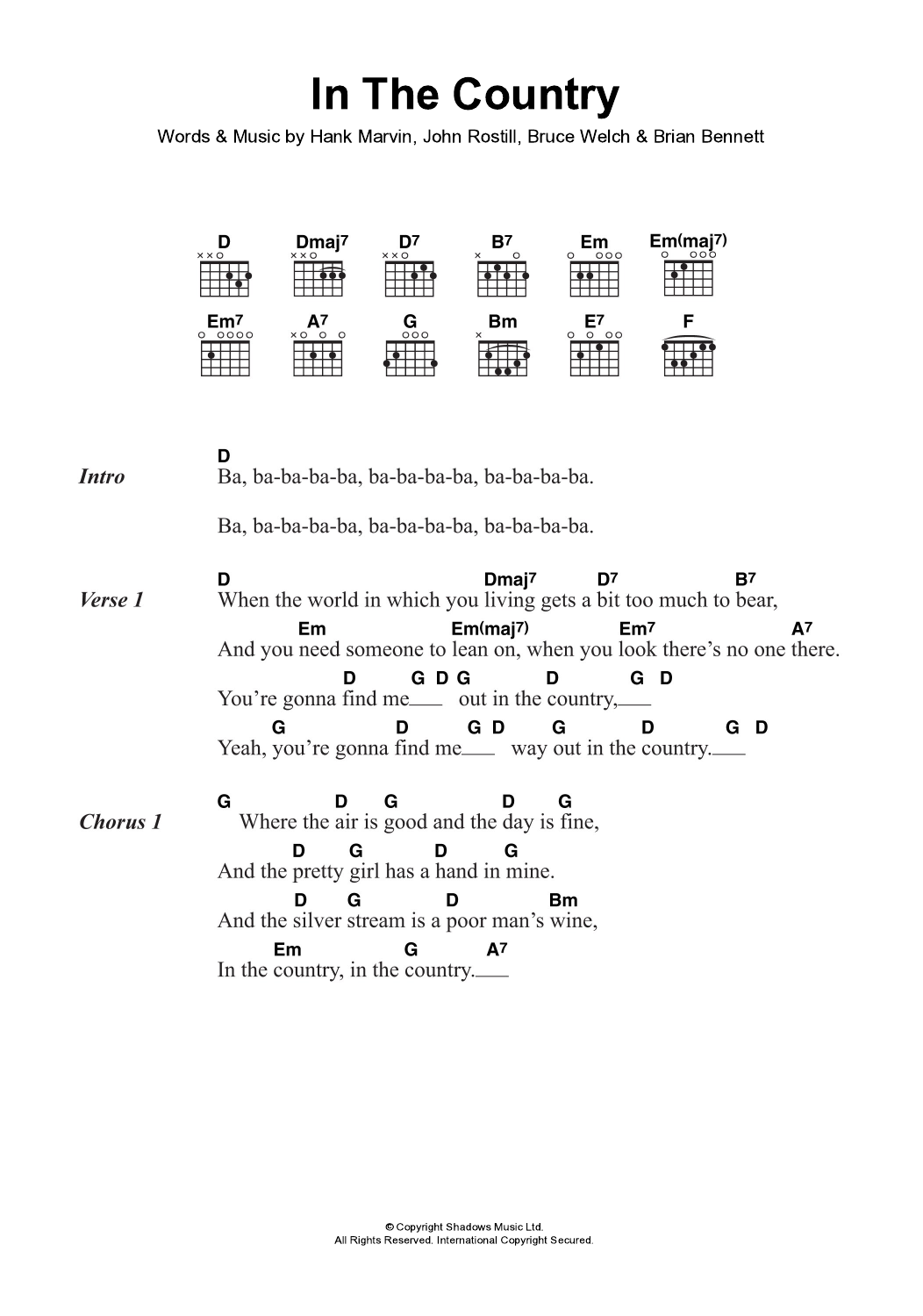 Cliff Richard & The Shadows In The Country sheet music, chords, lyrics - Printable PDF for Lyrics & Chords