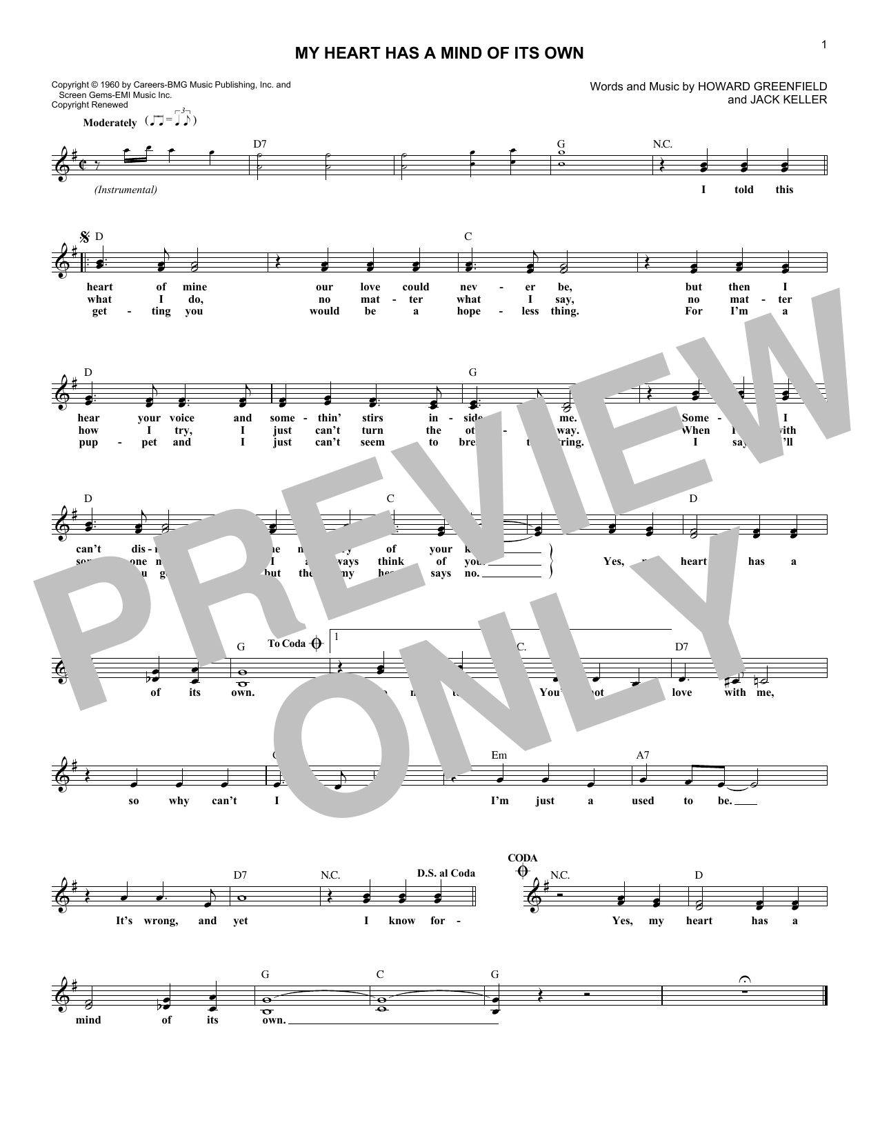 Connie Francis My Heart Has A Mind Of Its Own sheet music, chords, lyrics - Printable PDF for Melody Line, Lyrics & Chords