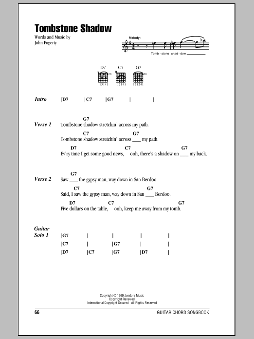 Download Creedence Clearwater Revival Tombstone Shadow sheet music and printable PDF notes for Guitar Chords/Lyrics. This score composition includes 2 page(s). It was wonderfuly put together for the style of Rock with catalog SKU number of 81593. Popular song was originally published on 2011-05-13T00:00:00 and was updated on 2020-11-25T00:00:00. The arrangement code for Creedence Clearwater Revival sheet music is LC and minimum required purchase quantaty of the digital score is 1. Learn more about Creedence Clearwater Revival and click here ».