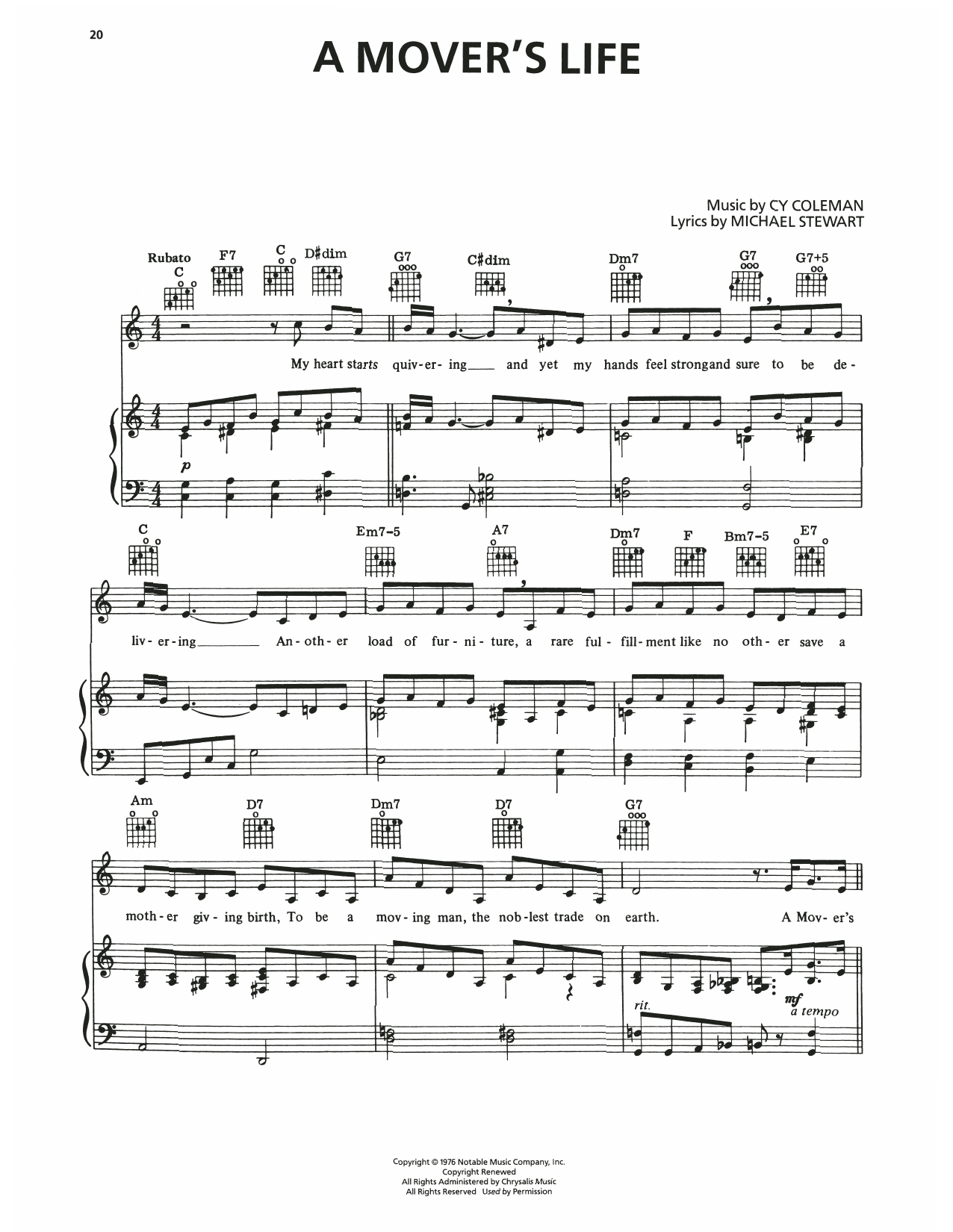 Cy Coleman A Mover's Life (from I Love My Wife) sheet music, chords, lyrics - Printable PDF for Piano, Vocal & Guitar Chords (Right-Hand Melody)