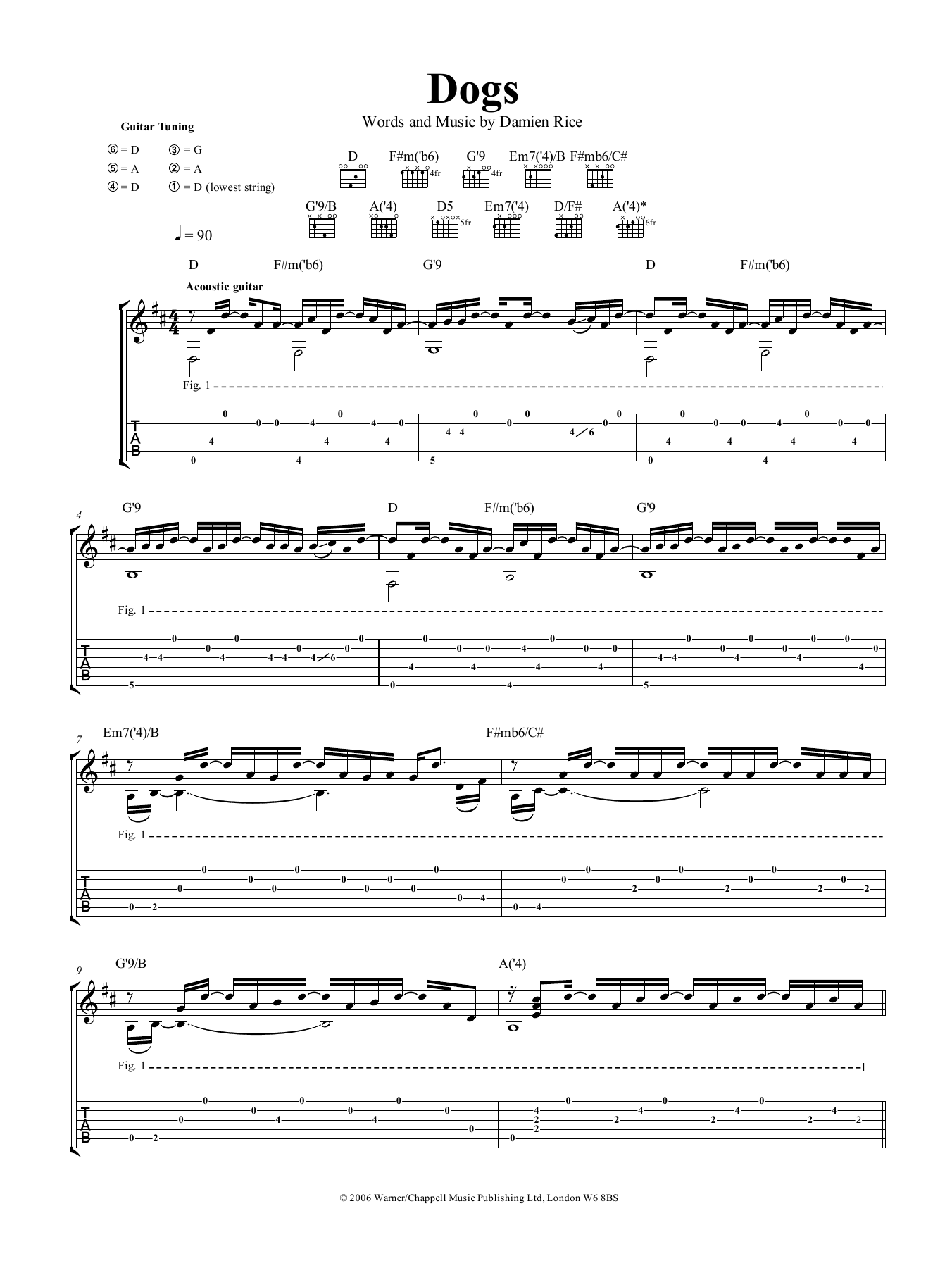 Damien Rice Dogs sheet music, chords, lyrics - Printable PDF for Guitar Tab