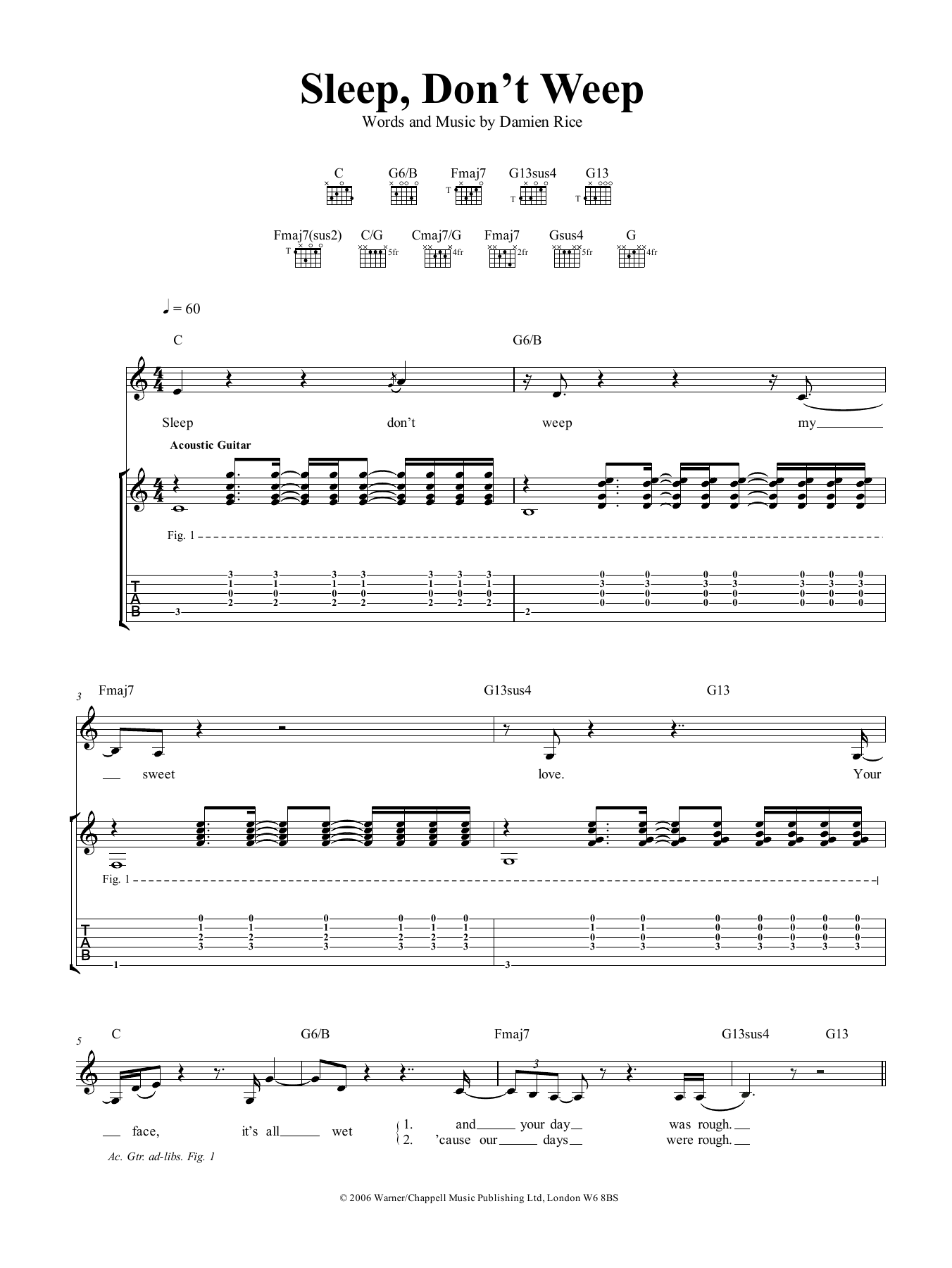 Damien Rice Sleep, Don't Weep sheet music, chords, lyrics - Printable PDF for Guitar Tab