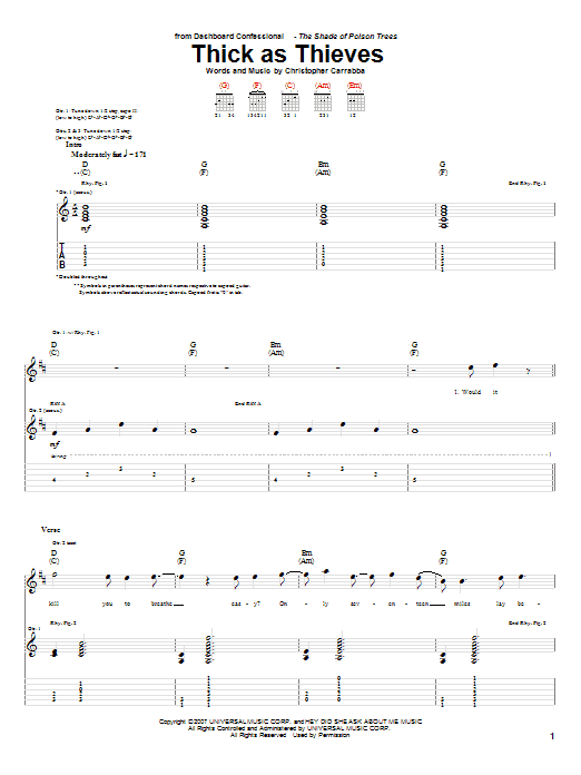 Dashboard Confessional Thick As Thieves sheet music, chords, lyrics - Printable PDF for Guitar Tab