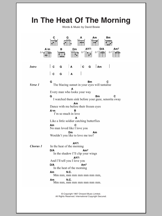 David Bowie In The Heat Of The Morning sheet music, chords, lyrics - Printable PDF for Lyrics & Chords