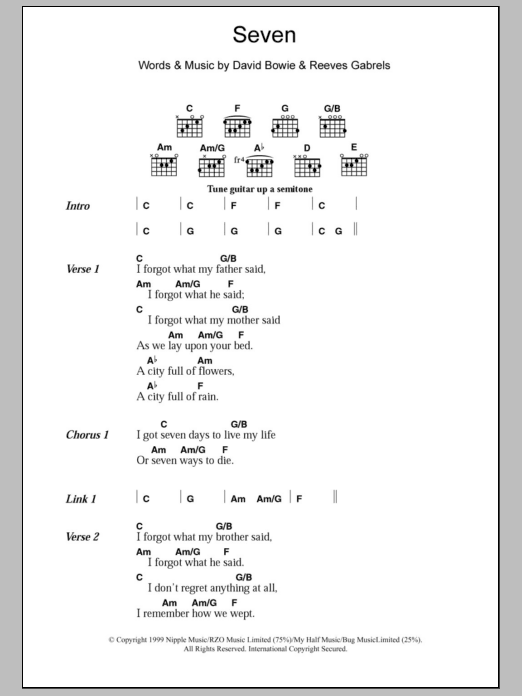 David Bowie Seven sheet music, chords, lyrics - Printable PDF for Lyrics & Chords