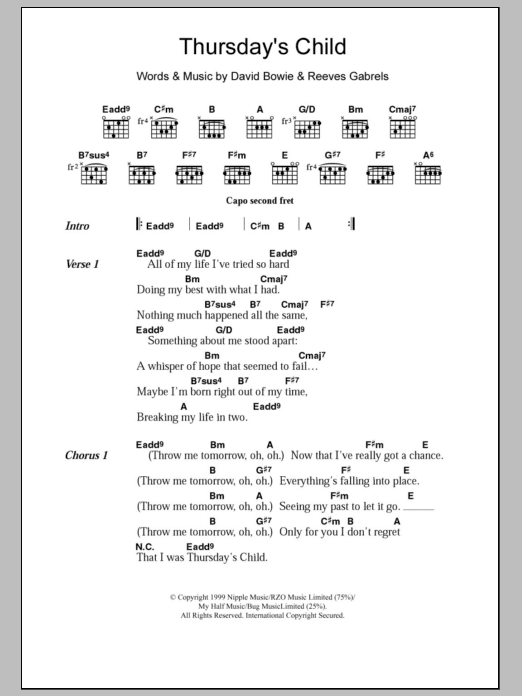 David Bowie Thursday's Child sheet music, chords, lyrics - Printable PDF for Lyrics & Chords