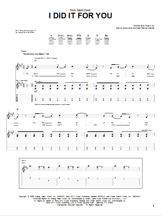 David Cook I Did It For You sheet music, chords, lyrics - Printable PDF for Guitar Tab