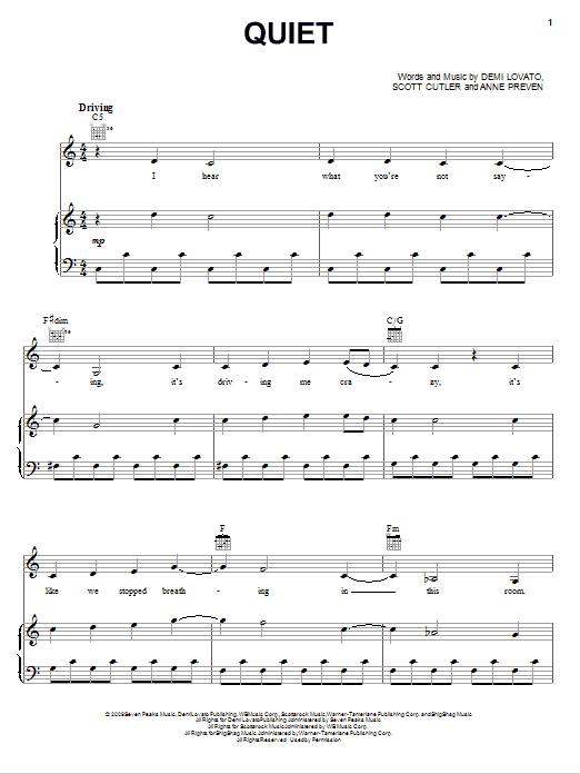 Demi Lovato Quiet sheet music, chords, lyrics - Printable PDF for Piano, Vocal & Guitar (Right-Hand Melody)