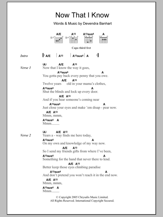 Devendra Banhart Now That I Know sheet music, chords, lyrics - Printable PDF for Lyrics & Chords