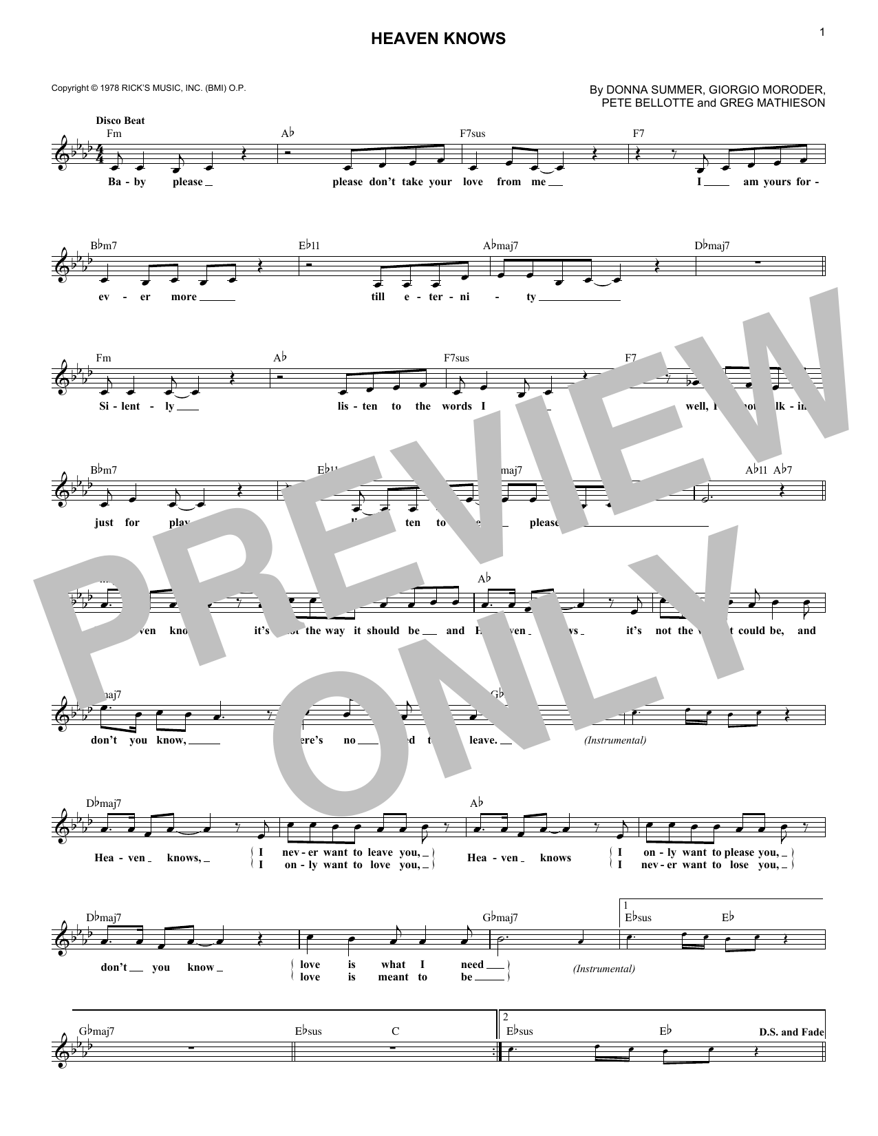 Donna Summer w/Brooklyn Dreams Heaven Knows sheet music, chords, lyrics - Printable PDF for Melody Line, Lyrics & Chords