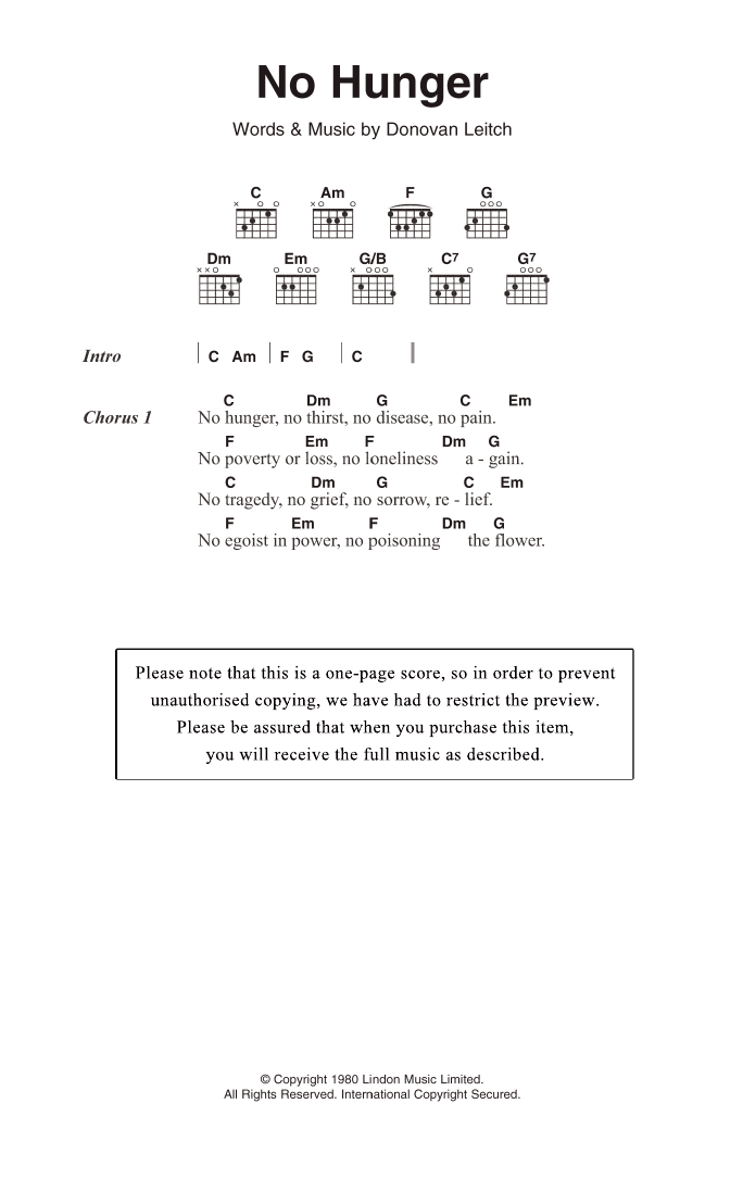 Donovan No Hunger sheet music, chords, lyrics - Printable PDF for Lyrics & Chords