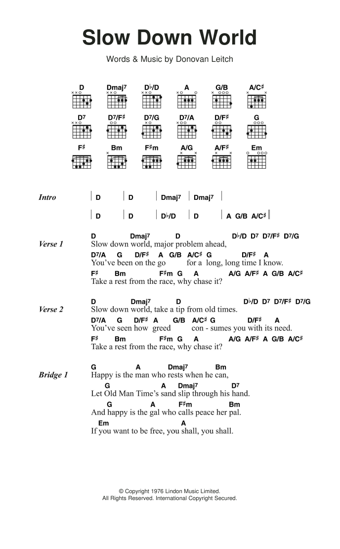 Donovan Slow Down World sheet music, chords, lyrics - Printable PDF for Lyrics & Chords