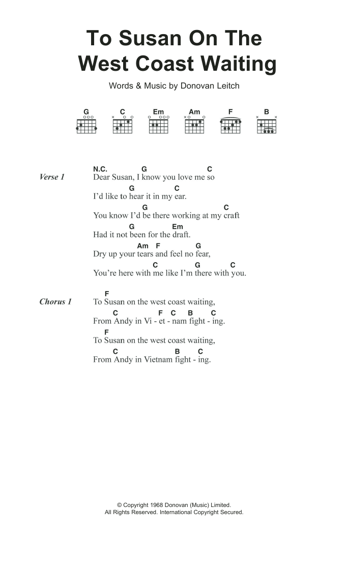 Donovan To Susan On The West Coast sheet music, chords, lyrics - Printable PDF for Lyrics & Chords