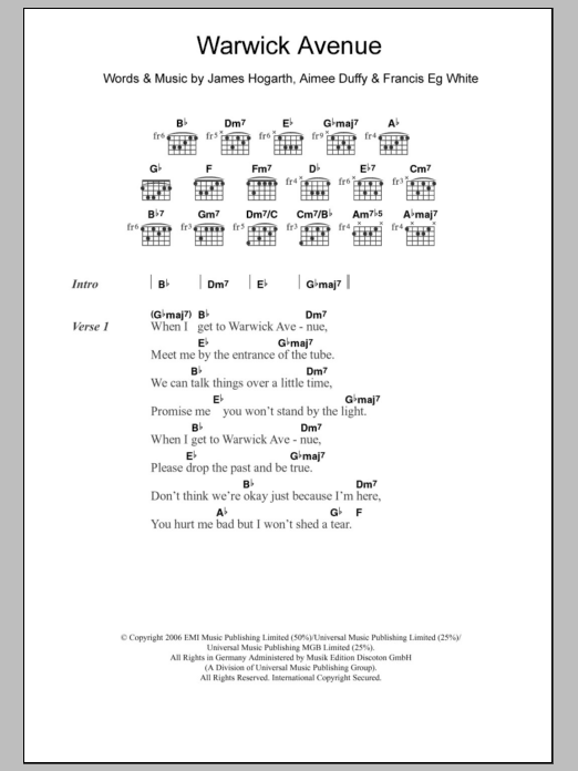Duffy Warwick Avenue sheet music, chords, lyrics - Printable PDF for Lyrics & Chords