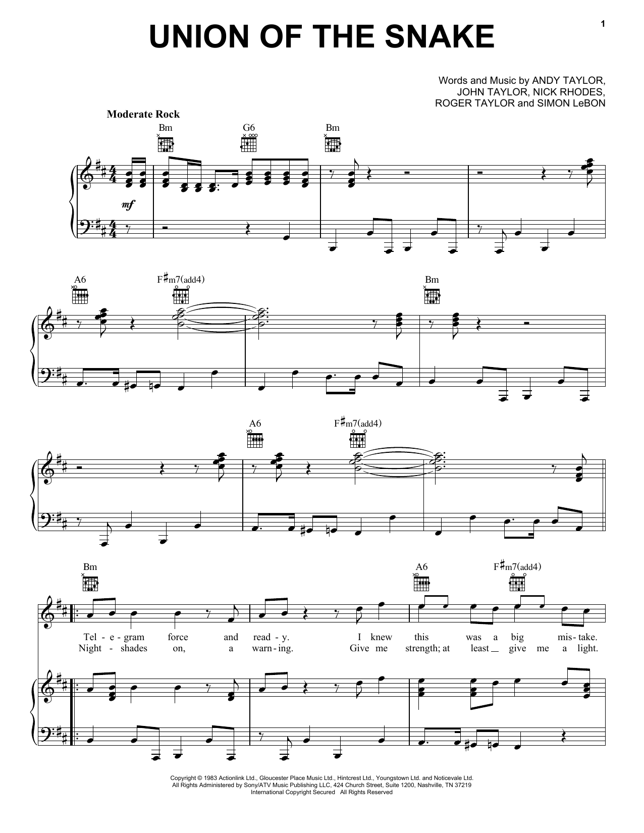 Duran Duran Union Of The Snake sheet music, chords, lyrics - Printable PDF for Piano, Vocal & Guitar (Right-Hand Melody)