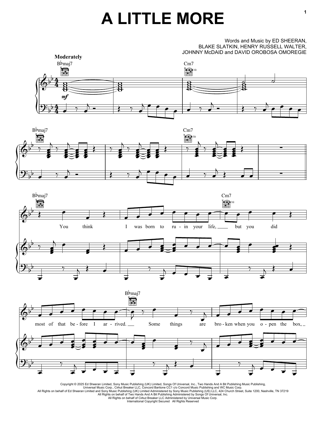 Download Ed Sheeran A Little More sheet music and printable PDF notes for Piano, Vocal & Guitar Chords (Right-Hand Melody). This score composition includes 8 page(s). It was wonderfuly put together for the style of Pop with catalog SKU number of 1814976. Popular song was originally published on 2025-08-25T00:00:00 and was updated on 2025-08-25T00:00:00. The arrangement code for Ed Sheeran sheet music is PVGRHM and minimum required purchase quantaty of the digital score is 1. Learn more about Ed Sheeran and click here ».