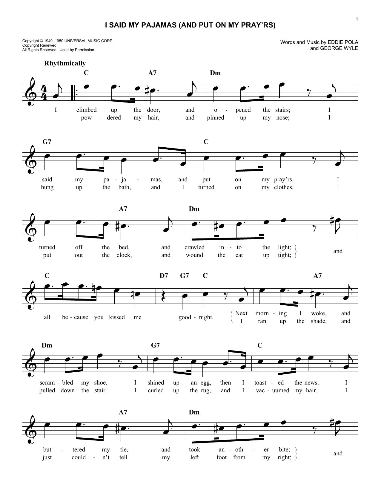 Eddie Pola I Said My Pajamas (And Put On My Pray'rs) sheet music, chords, lyrics - Printable PDF for Melody Line, Lyrics & Chords