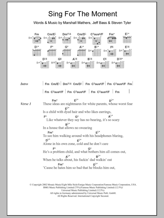 Eminem Sing For The Moment sheet music, chords, lyrics - Printable PDF for Lyrics & Chords