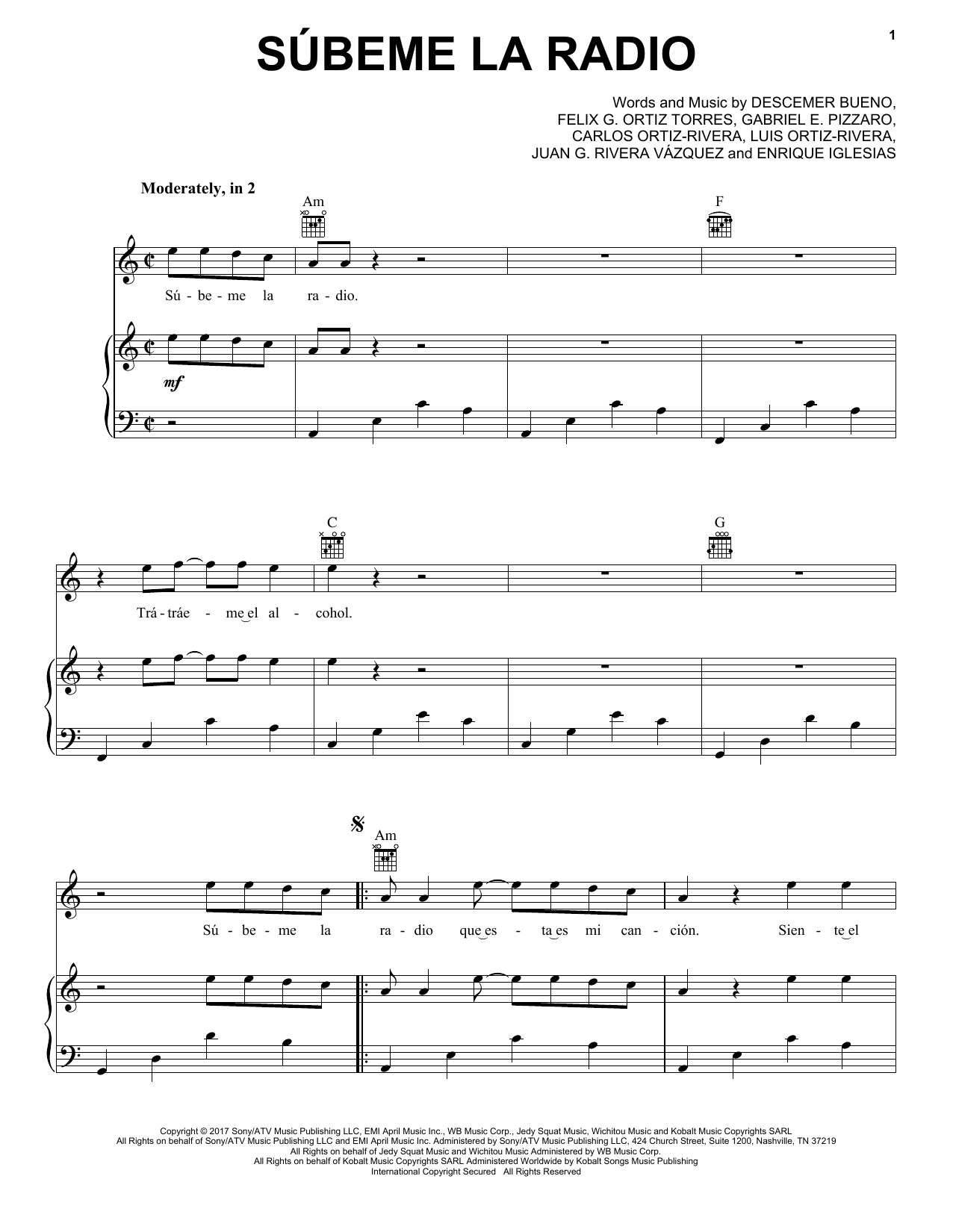 Download Enrique Iglesias Subeme La Radio sheet music and printable PDF notes for Piano, Vocal & Guitar Chords (Right-Hand Melody). This score composition includes 8 page(s). It was wonderfuly put together for the style of Pop with catalog SKU number of 180360. Popular song was originally published on 2017-03-04T00:00:00 and was updated on 2023-01-18T00:00:00. The arrangement code for Enrique Iglesias sheet music is PVGRHM and minimum required purchase quantaty of the digital score is 1. Learn more about Enrique Iglesias and click here ».